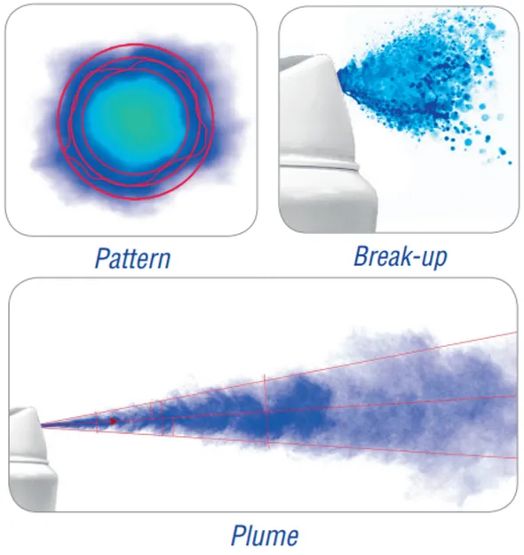 - Particle homogeneity: shape, density and uniformity across the spray cross-section