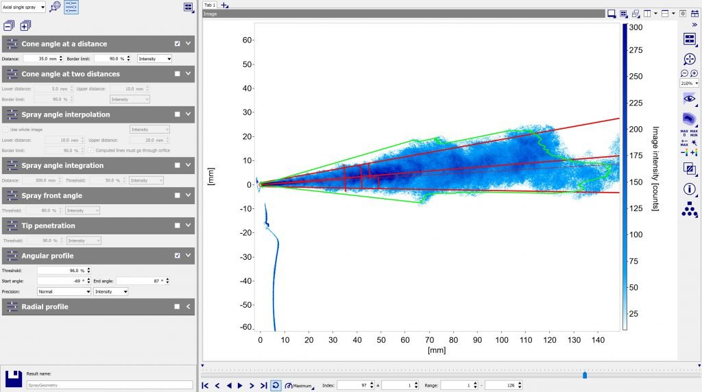 - Dynamic visualization: through time-resolved video analyses of the spray development